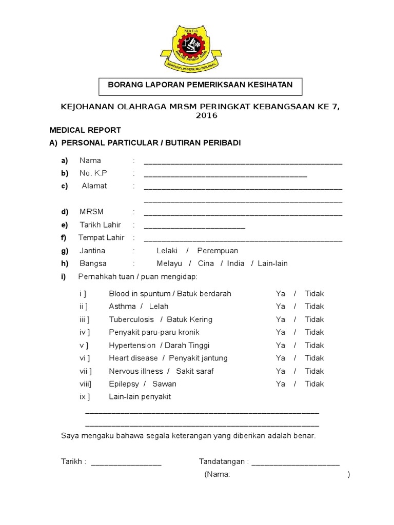 Simpan Simpan Contoh borang laporan denggi Untuk Nanti. Sila isi borang dengan menggunakan huruf besar. BORANG LAPORAN PEMERIKSAAN KESIHATAN LAPORAN PEMERIKSAAN KESIHATAN REPORT OF HEALTH EXAMINATION 1.